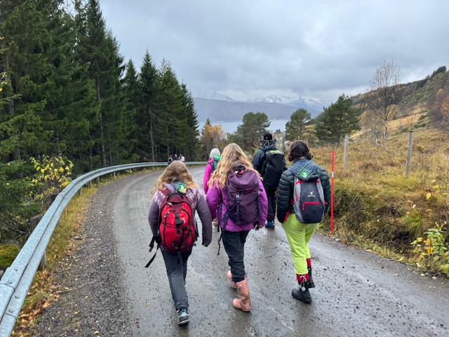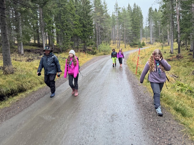 Det er 1,7 km ned fra skytterbanen til skolen, men patrule Oter var i godt humør og sang speidersanger på veien. Lett yr satte ikke dempning på stemningen.